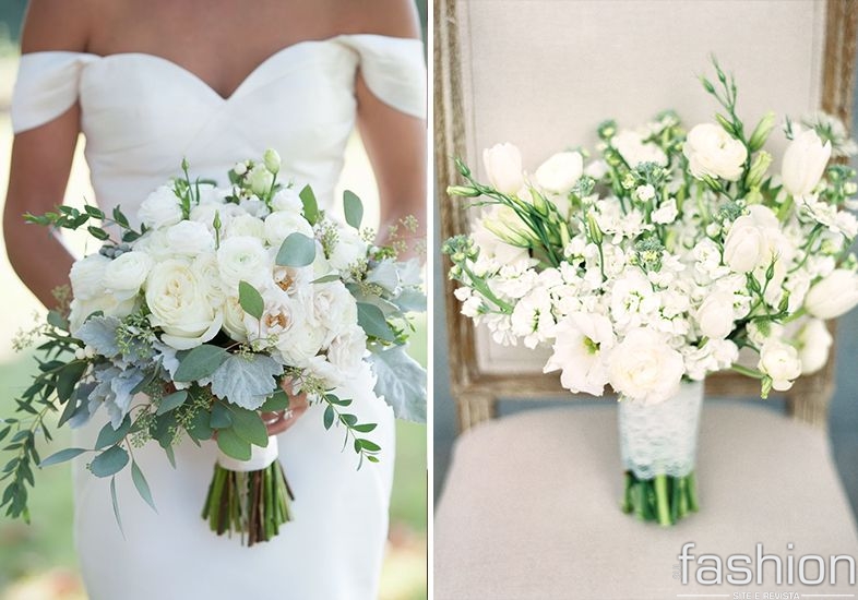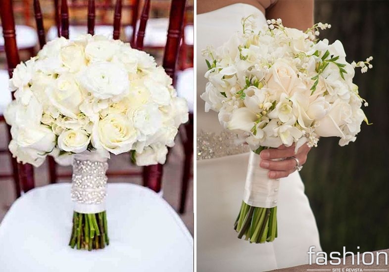 "Engana-se quem pensa que o buquê branco deixa o visual da noiva apagado. Ele passa uma imagem sofisticada, de muita elegância. A base pode ser decorada com fitas, tecidos rústicos ou apliques de joias. Não tem como errar", afirmou a wedding planner Edna Mota.
