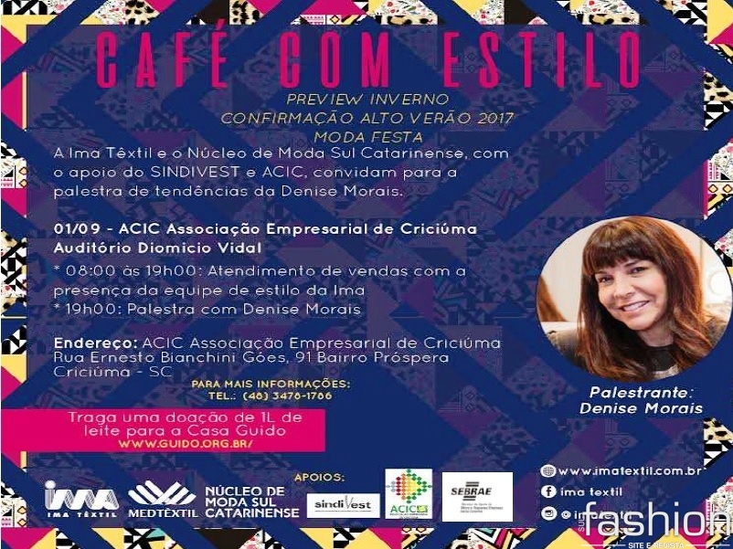 "É mais uma grande oportunidade de qualificação profissional para gestores, profissionais e estudantes de moda da região. O evento é gratuito, mas solicitamos a doação de 1 litro de leite para a Casa Guido, em uma contrapartida social", afirma a assessora executiva do NMSC, Milse Maia.