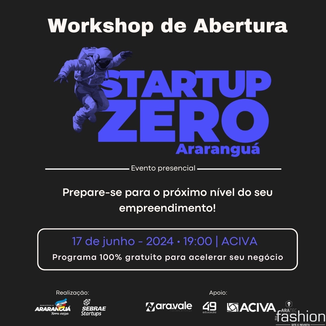 O Startup Zero é um programa 100% gratuito para acelerar o seu negócio. Você terá acesso a conteúdos exclusivos, aulas ao vivo, oficinas presenciais e demo day com investidores especializados. E para começar o programa com o pé direito, preparamos um grande evento presencial que será realizado no dia 17, às 19h na sede da ACIVA (Av. Getúlio Vargas, n° 415)