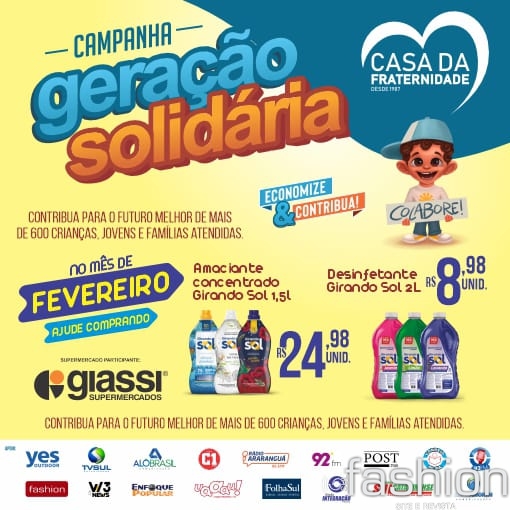 Numa parceria que entra no sétimo ano, a Campanha Geração Solidária em parceria com a Rede Giassi Supermercados que visa angariar recursos para a manutenção dos serviços prestados pela instituição a centenas de crianças e adolescentes, nesse ano de 2025 está disponibilizando a cada mês, dois produtos que a cada unidade vendida a empresa participante reverte um percentual para a entidade.