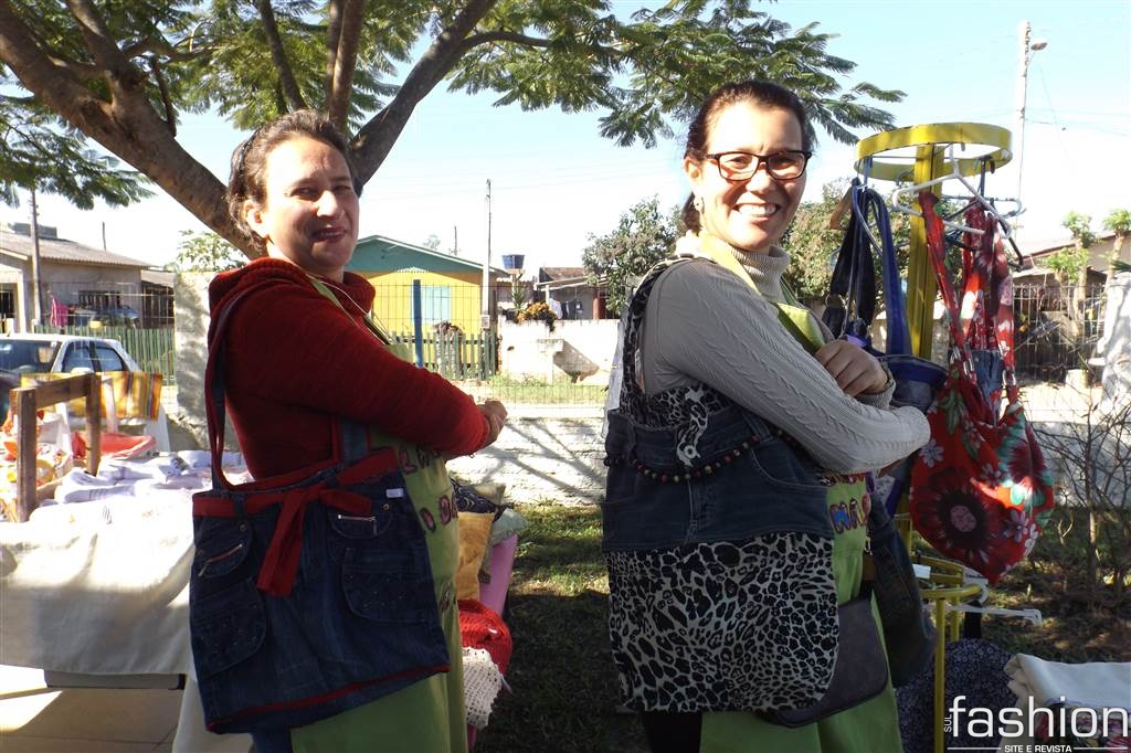 Uma das peças mais bacanas é a bolsa feita com jeans usado, que é todo customizado, e se transforma em um belo acessório. O grupo recebe doações de tecidos para confeccionar os trabalhos.