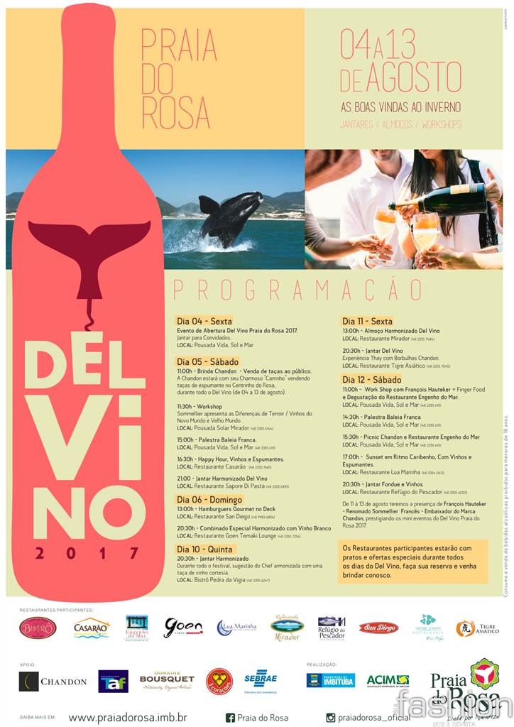 A Praia do Rosa, em Imbituba, já está no clima de mais uma edição do Agosto Del Vino, festival enogastronômico que ocorrerá de 4 a 13 de agosto, em 10 estabelecimentos, entre pousadas e restaurantes. Confirmada neste fim de semana, a programação oficial terá palestras, degustações, harmonizações, workshop internacional e até piquenique. A organização é do Núcleo de Gastronomia da Associação Empresarial de Imbituba (Acim), com realização do Sebrae/SC e apoio da Prefeitura Municipal de Imbituba.