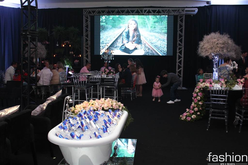 No espaço do Parque das Águas, a estrutura montada para receber os convidados encantou em cada detalhe que carrega o conceito JC: pista personalizada onde a aniversariante dançou a tradicional valsa com pai, avôs e padrinhos, arranjos florais, centenas de rosas, botões abertos um a um, salão todo revestido em black carpet, mesa redonda com pés de escorpião, a dos pais, revestida com centenas de rosas e o verdadeiro must icônico, a banheira cheia com energético Red Bull, um toque único e diferenciado na festa.