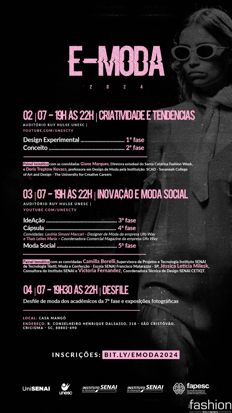 Venha conferir a programação desse evento imperdível que reúne os talentos do curso superior de tecnologia de Design de Moda UniSenai-UNESC. Uma jornada de tendências, moda social, desfile e muita informação sobre moda.