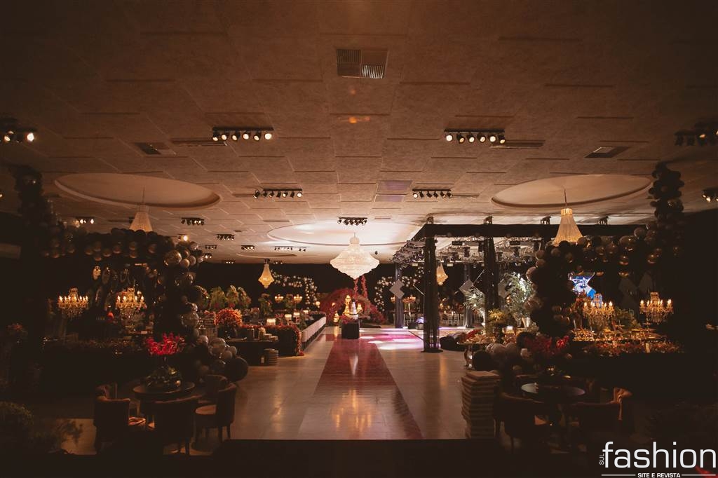 Todo o esplendor do salão pensado especialmente para a aniversariante, desde o jardim/ sala de doces, flores e esculturas suspensas contrastando perfeitamente entre o moderno e o romântico, estrutura de pista/painel led e o show da Cantora Liz Cardoso num mix de estilos, para os amigos e familiares presentes na mágica noite da Daiane Rigo.