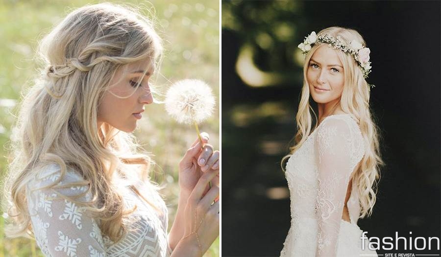 Para um casamento no campo ou na praia, com um vestido mais fluido, leve e clean, o cabelo mais solto, meio preso, com tranças e acessórios leves, como flores naturais, por exemplo combina muito com a proposta e deixa um ar super romântico.
