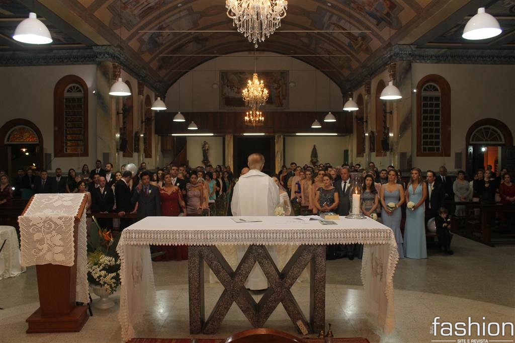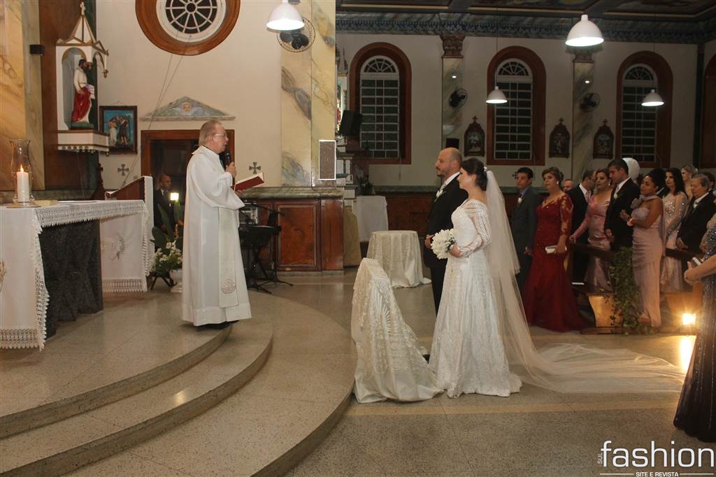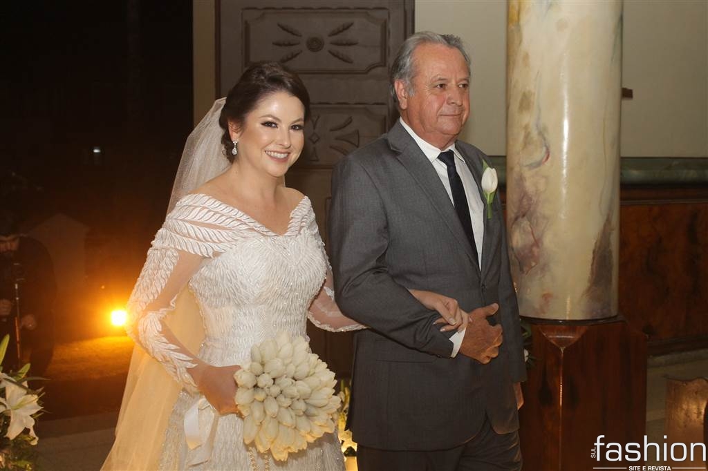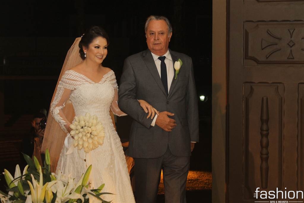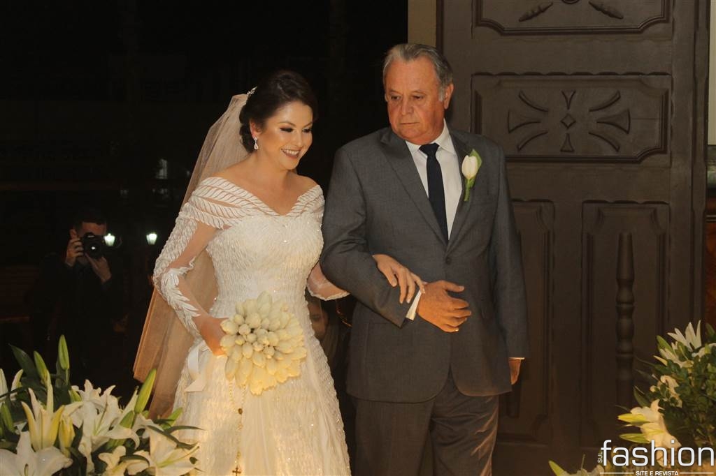 O vestido da noiva, digno de uma princesa, em corte inteiro linha A, rendado, todo bordado com vidrilhos preciosa e cristais swarovski assinado por Ateliê Madame Scheffer, enalteceu ainda mais a beleza da noiva que adentrou e atravessou a nave causando frisson.