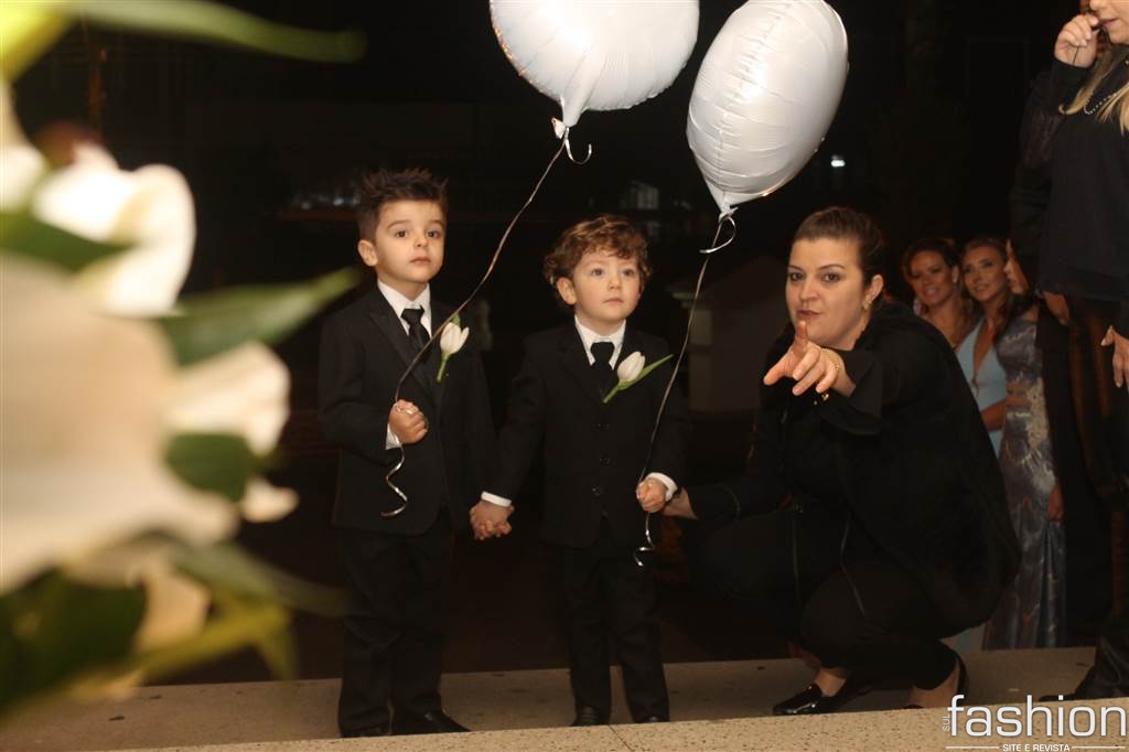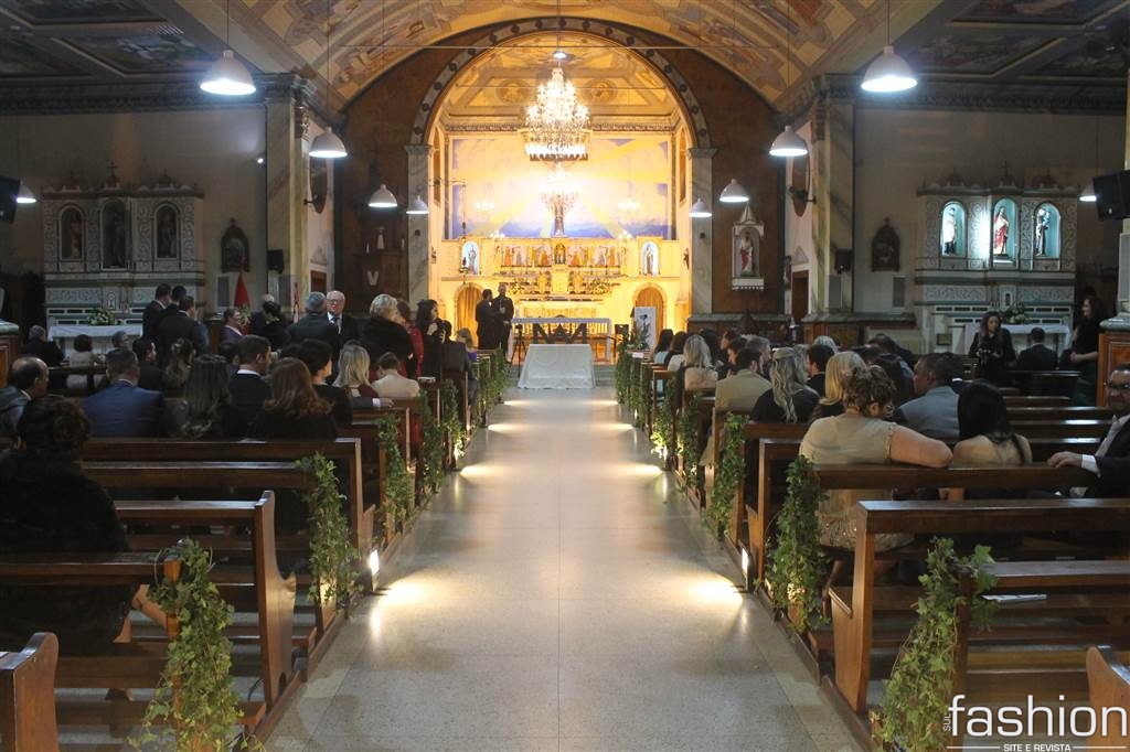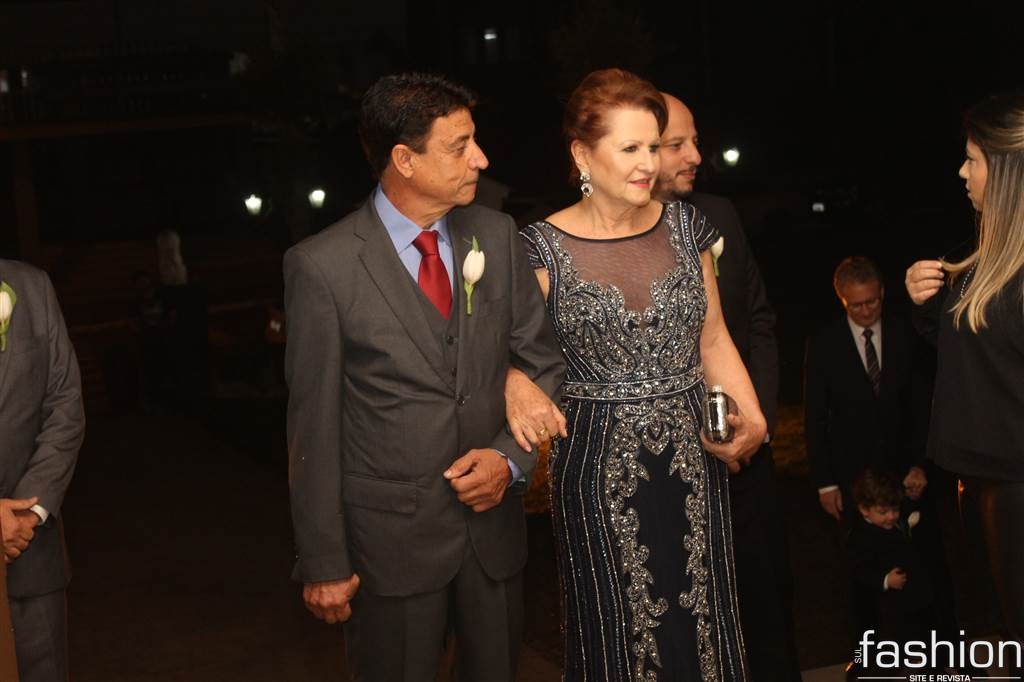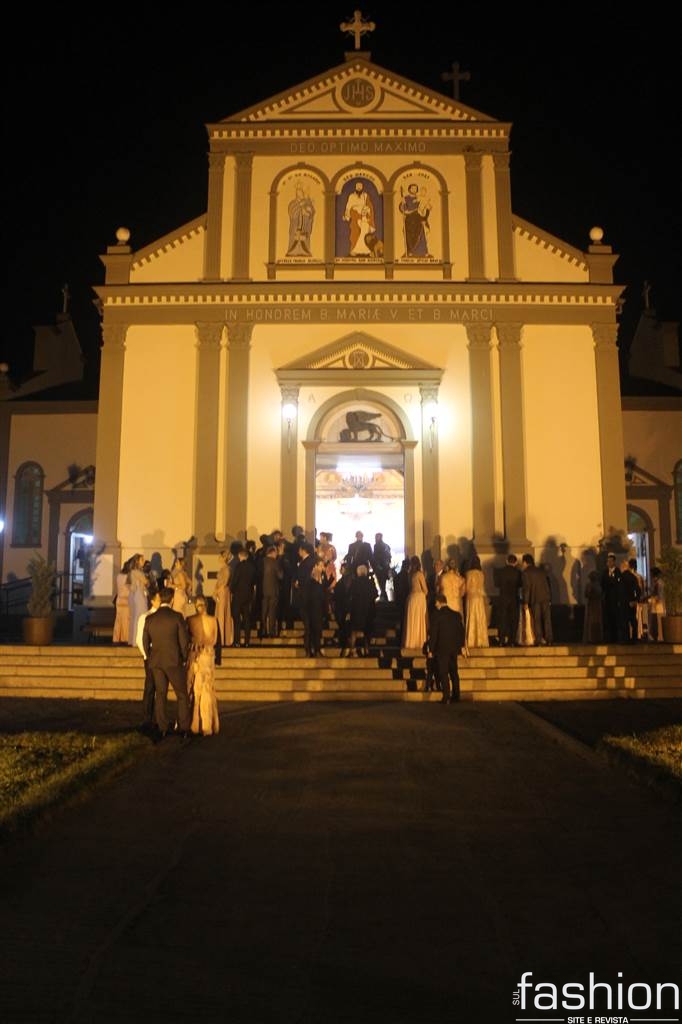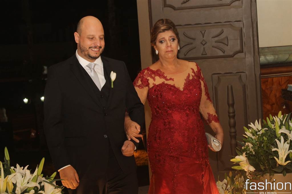 O vestido da noiva, digno de uma princesa, em corte inteiro linha A, rendado, todo bordado com vidrilhos preciosa e cristais swarovski assinado por Ateliê Madame Scheffer, enalteceu ainda mais a beleza da noiva que adentrou e atravessou a nave causando frisson.