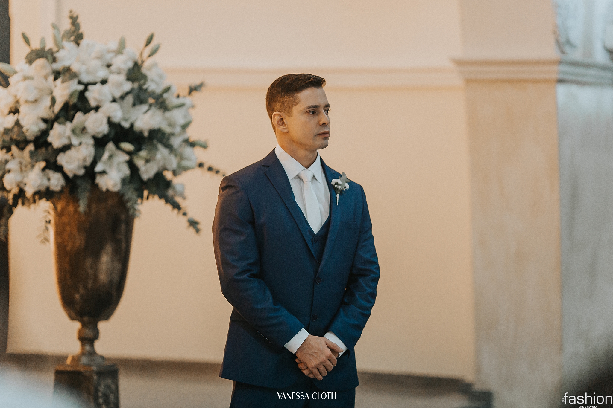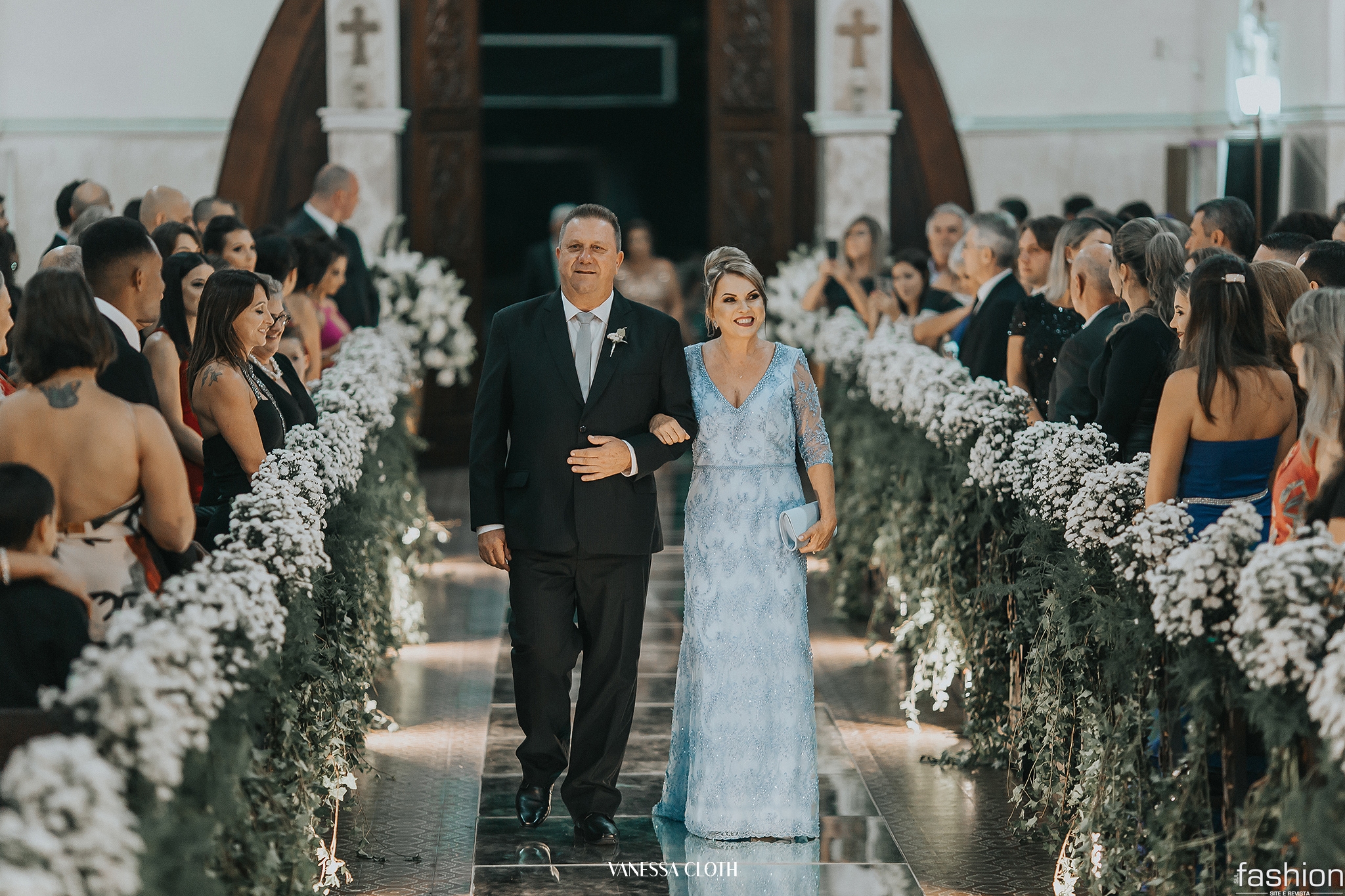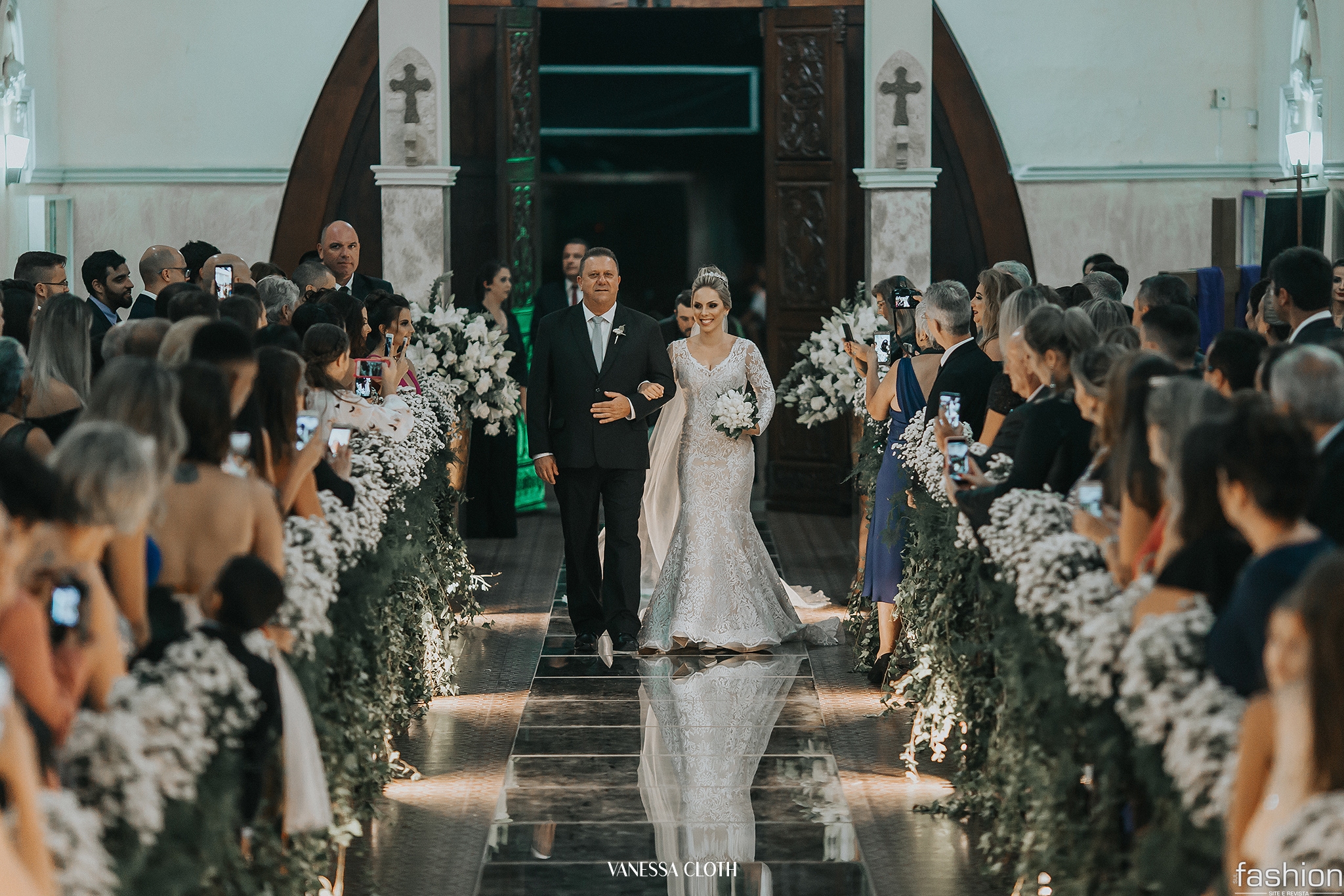 O vestido da noiva, no estilo sereia, em renda francesa rebordada em cristais, assinado pela Fashion Designer de Florianópolis Luhana Pawlick, valorizou ainda mais o shape e a beleza de Gabriela ao adentrar imponente na igreja.