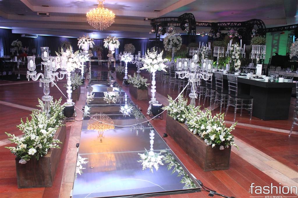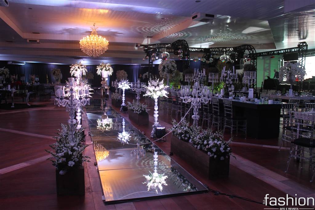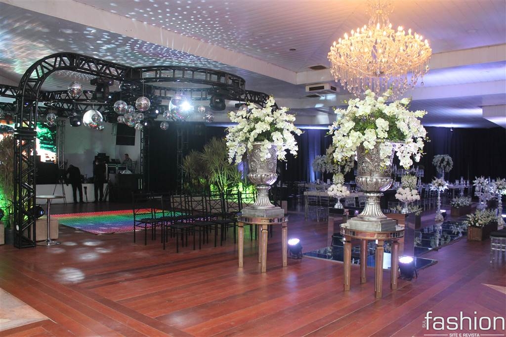 Trazendo ar romântico com toques de paixão veneziana aliada à modernidade dos light effects para a cerimônia e na recepção, com belíssimos arranjos florais, lustres e candelabros em critais, passarela espelhada, velas, espelhos e mesas venezianas, o clube se transformou para receber os 180 convidados do casal.