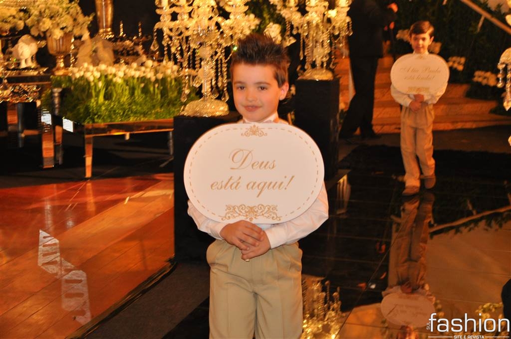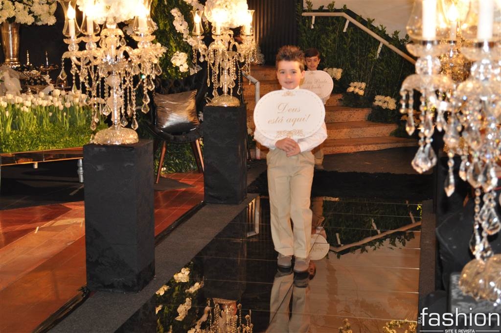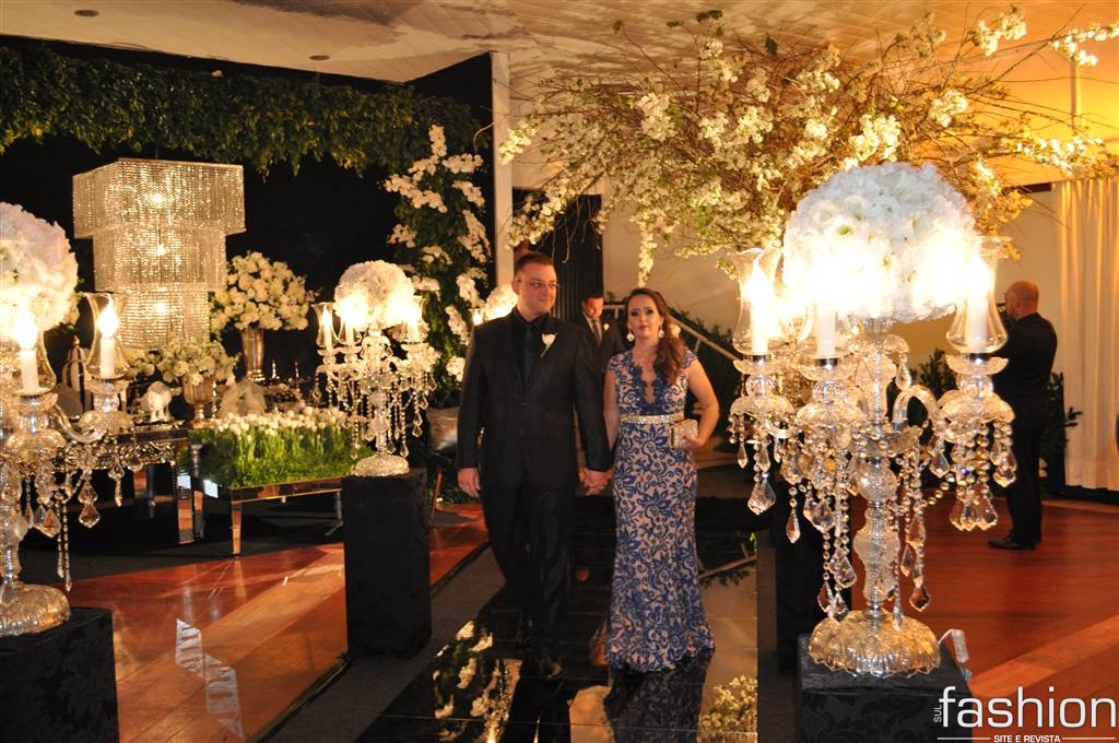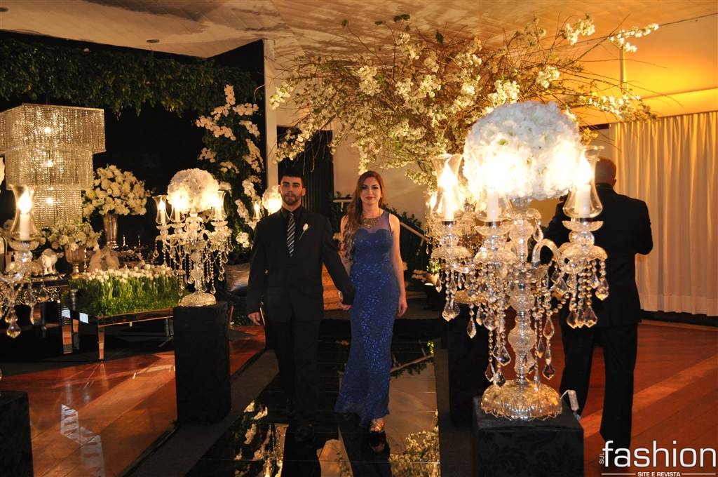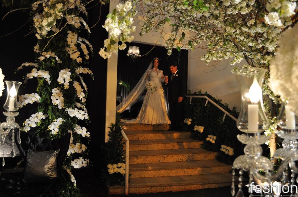 Atravessando a passarela espelhada, sob as luzes dos candelabros de cristais, os padrinhos e o noivo, que foi conduzido alegremente pela mãe até o altar montado dentro do clube, aguardavam a entrada triunfal da noiva, que surgiu na escadaria do salão com belíssimo vestido clássico, assinado por Ludi Aguiar, arrancando suspiros e lágrimas de seu futuro esposo.