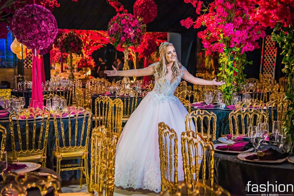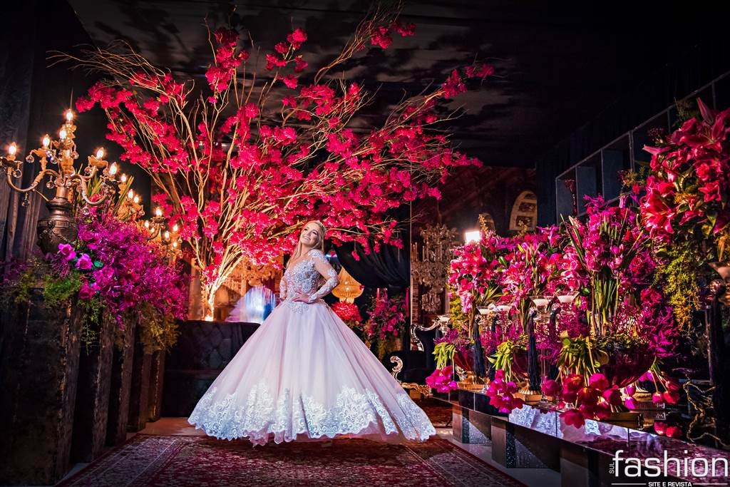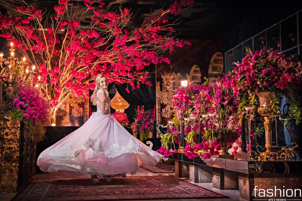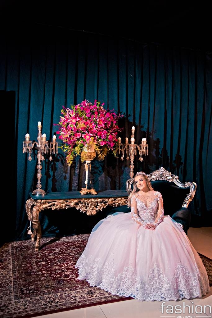 A dupla Jonatan Castelan e Eduardo Alves, da JC Lustres e Décor, ousando e quebrando com o tradicional, no salão da SACC, compôs arranjos de mesas, enormes lustres, globos aéreas em lisiantus na cor pink que caiam sobre a sweet table, passarelas e até teto de led se espalhavam pelo cenário. Árvores de buganvile em vários tamanhos, muitas velas, candelabros e lounges energizaram e realçaram ainda mais a beleza da princesa Manoela.