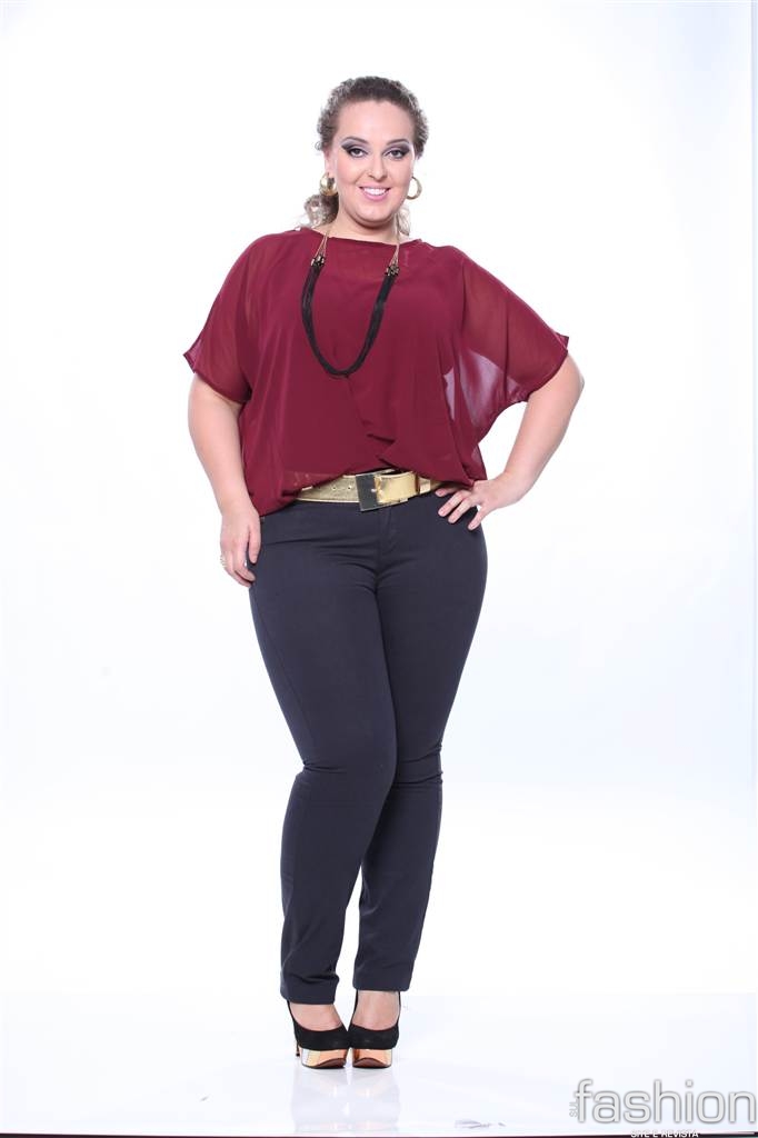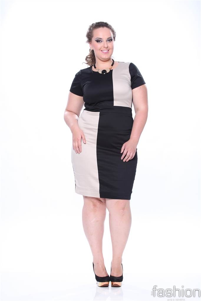 Para o manequim Pluz Size, outro mix de produtos Moça Bonita, as investidas para a temporada fria estão nos vestidos bicolores, camisas estampadas e em tecidos nobres que valorizem as curvas femininas.