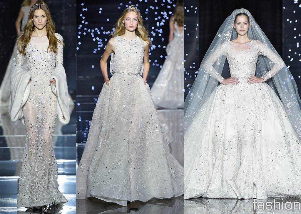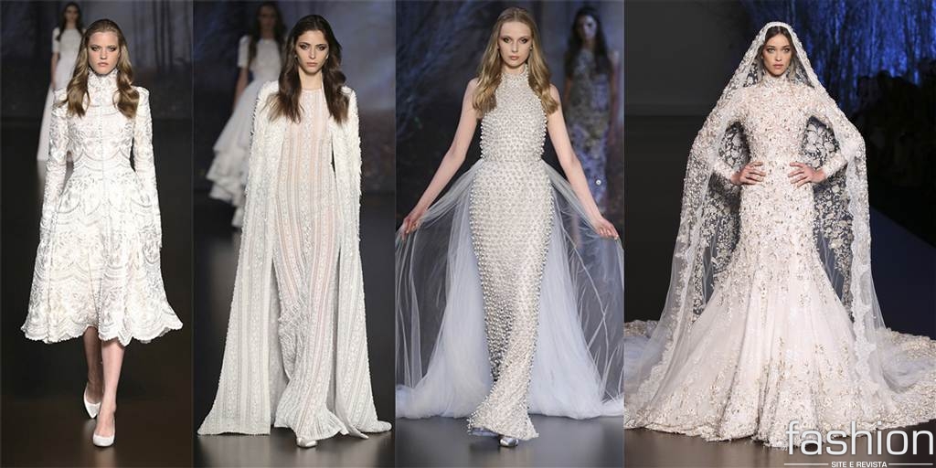 O estilista libanês Elie Saab apostou em modelos românticos que lembram a época medieval, usando detalhes de transparências e pedraria. Para a moda wedding, ele arrancou suspiros com o modelo clássico e volumoso da noiva dourada.