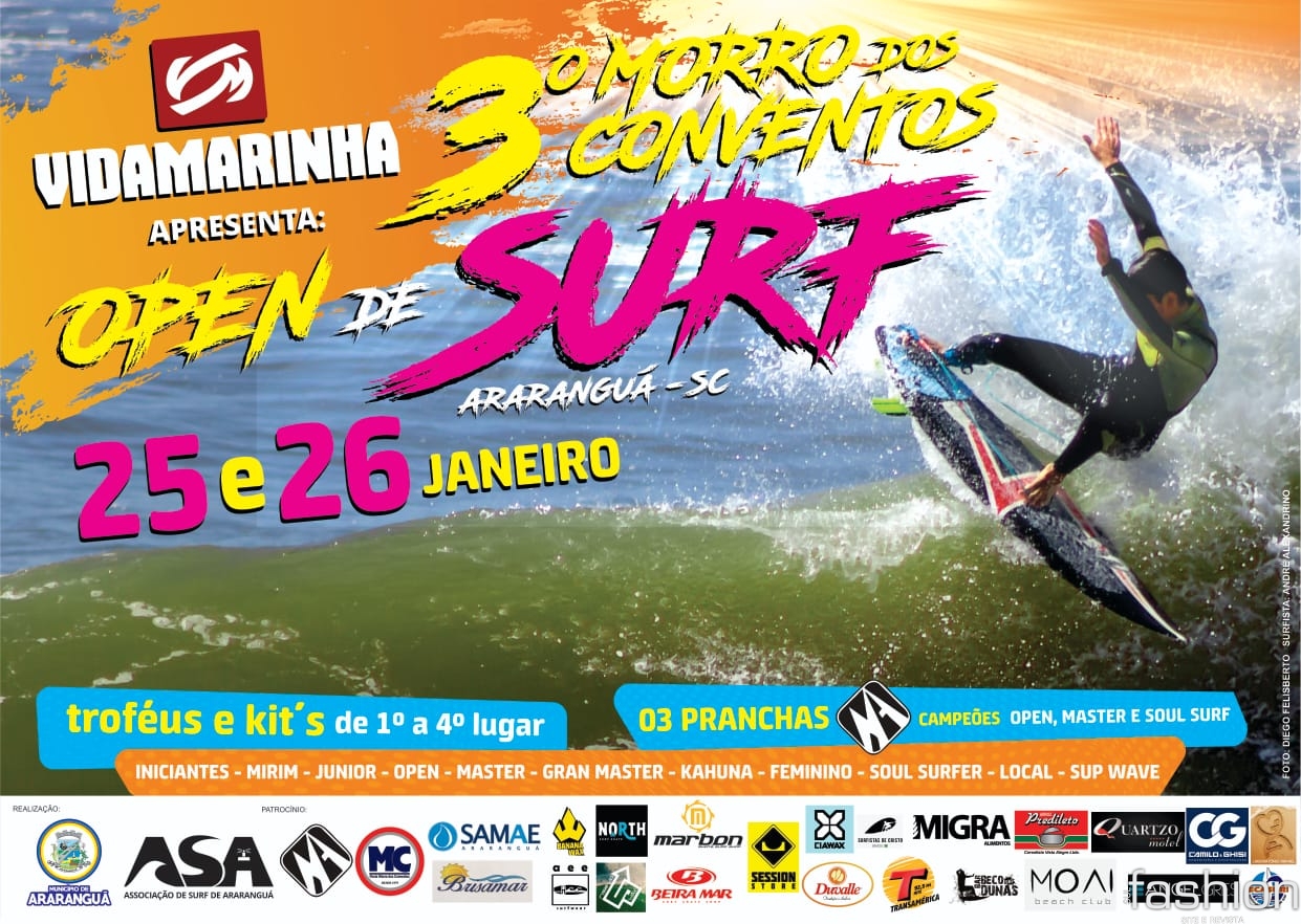 Sábado, 25, e domingo, 26, atletas de toda a região vão se encontrar na praia do Morro dos Conventos, em Araranguá, para as competições de surf amador. A Vida Marinha apresenta o 3º Morro dos Conventos Open de Surf, uma realização da Associação de Surf de Araranguá (ASA), com apoio da prefeitura de Araranguá.
