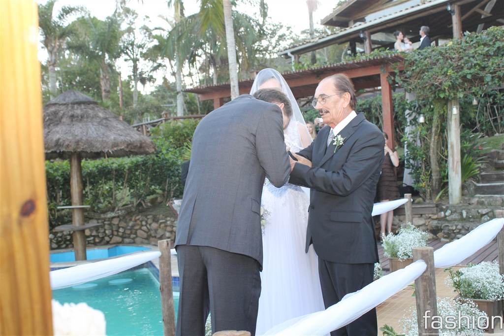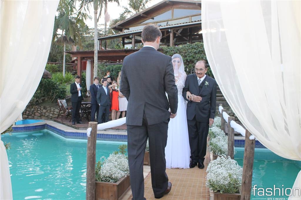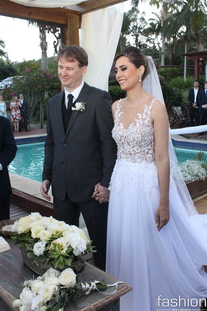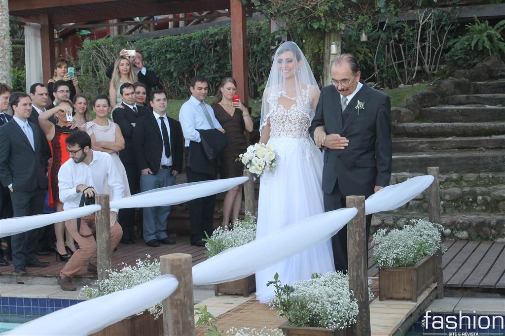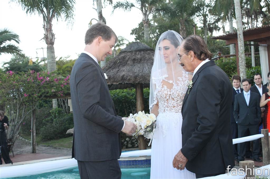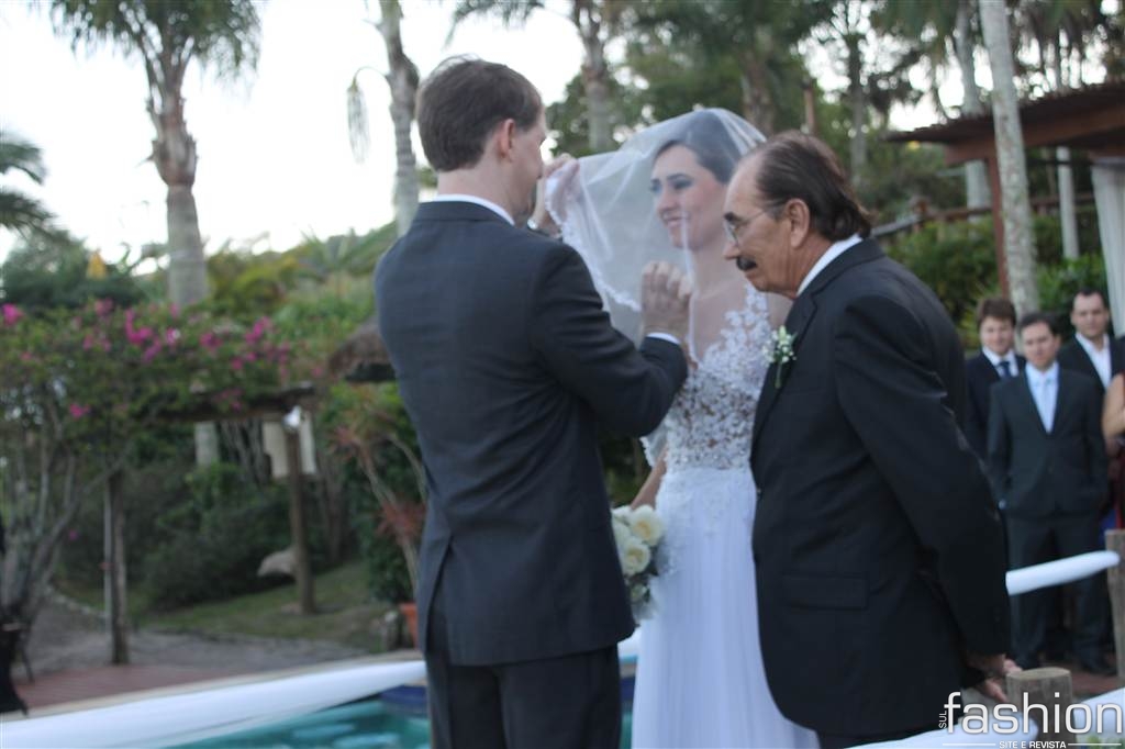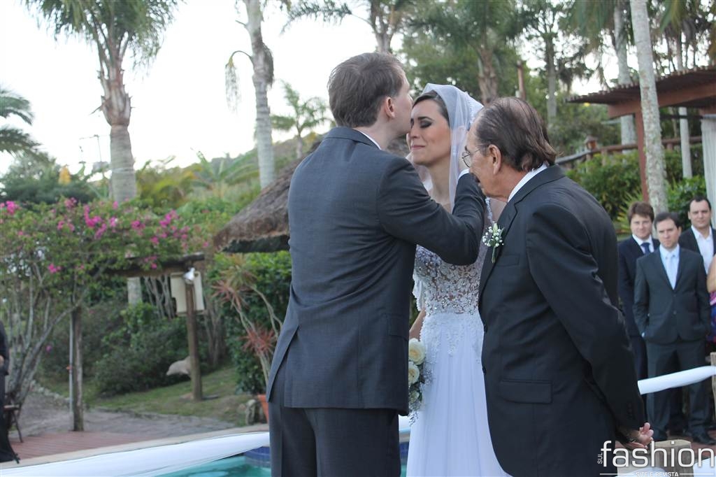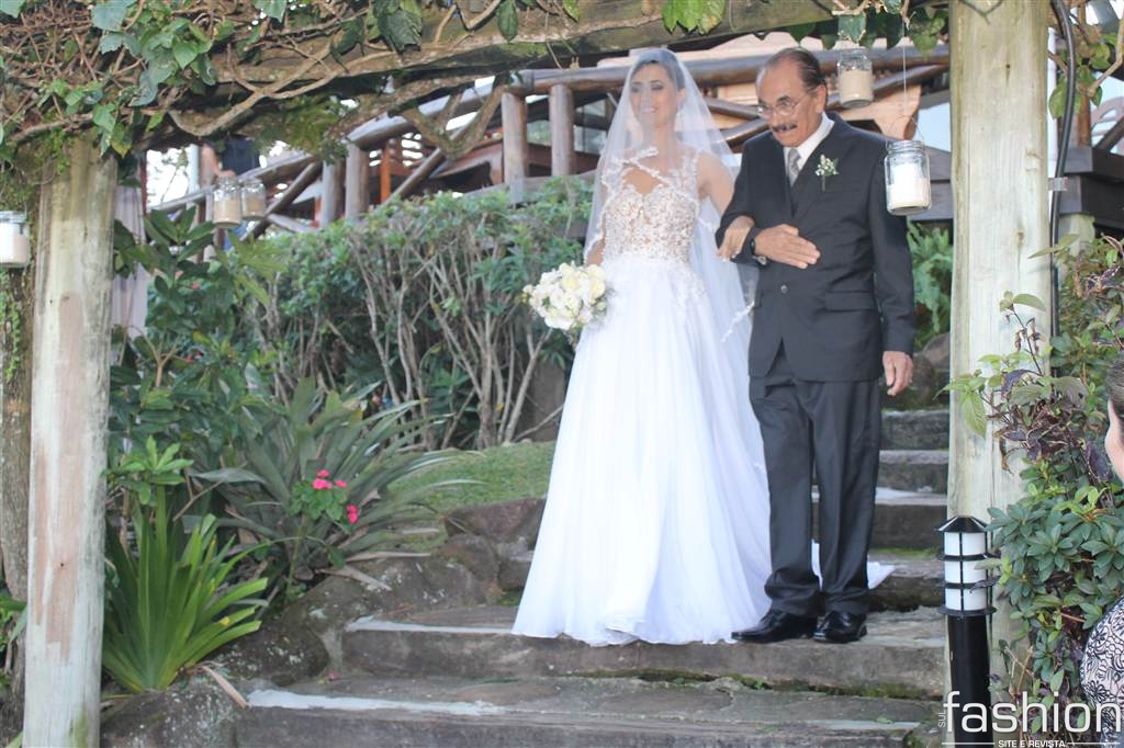 Já iniciava o pôr do sol, do dia 23 de maio, quando a linda noiva, Leila Ramos, surgia no alto da escada do Ecoresort &Beach Village Vida, Sol e Mar. Conduzida pelo pai Sebastião Ramos, ela, produzida por Fernanda Fernandes e com vestido by Melissa Thiesen, caminhou em direção ao noivo, Alexei Ramm, que, ansioso, a esperava amparado pelas belezas naturais da Praia do Rosa.