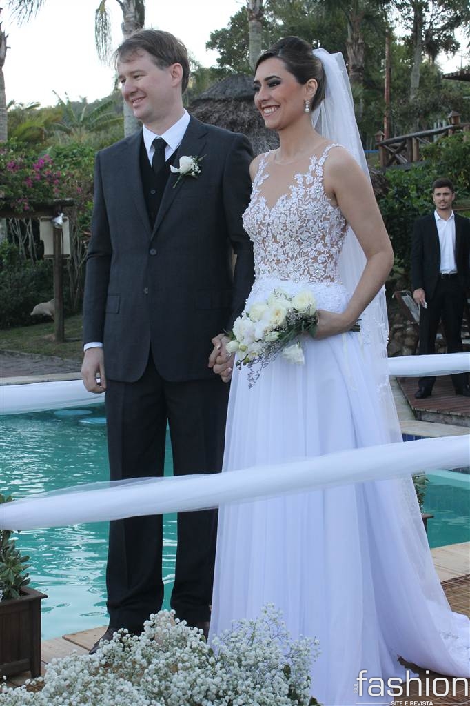 Com detalhes milimetricamente acertados, desde a troca de alianças até o beijo apaixonado após as juras de amor eterno, a cerimônia arrancou suspiros de todos. Após selarem matrimônio, os noivos, vibrando de alegria, acompanharam os convidados até o salão de festa, onde um delicioso buffet os aguardava.