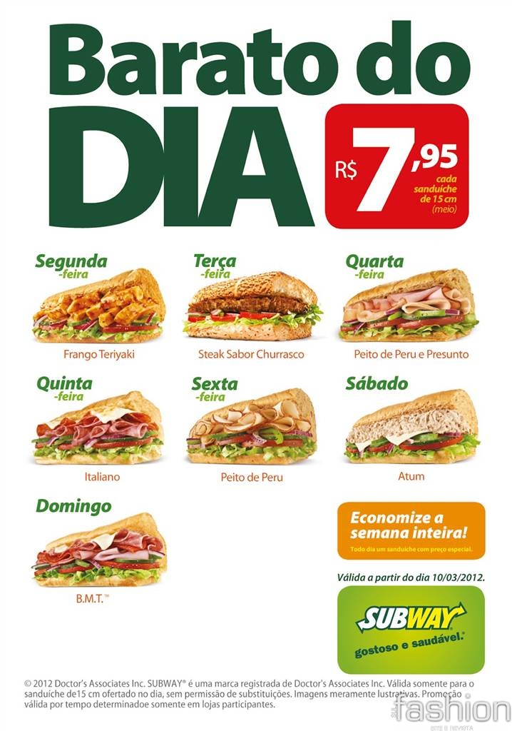Além de estar bem pertinho de você, a rede Subway também tem promoções que animam os clientes. Um exemplo é o "barato do dia", que oferece um lanche mais barato para cada dia da semana.