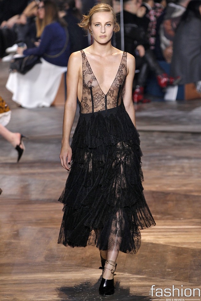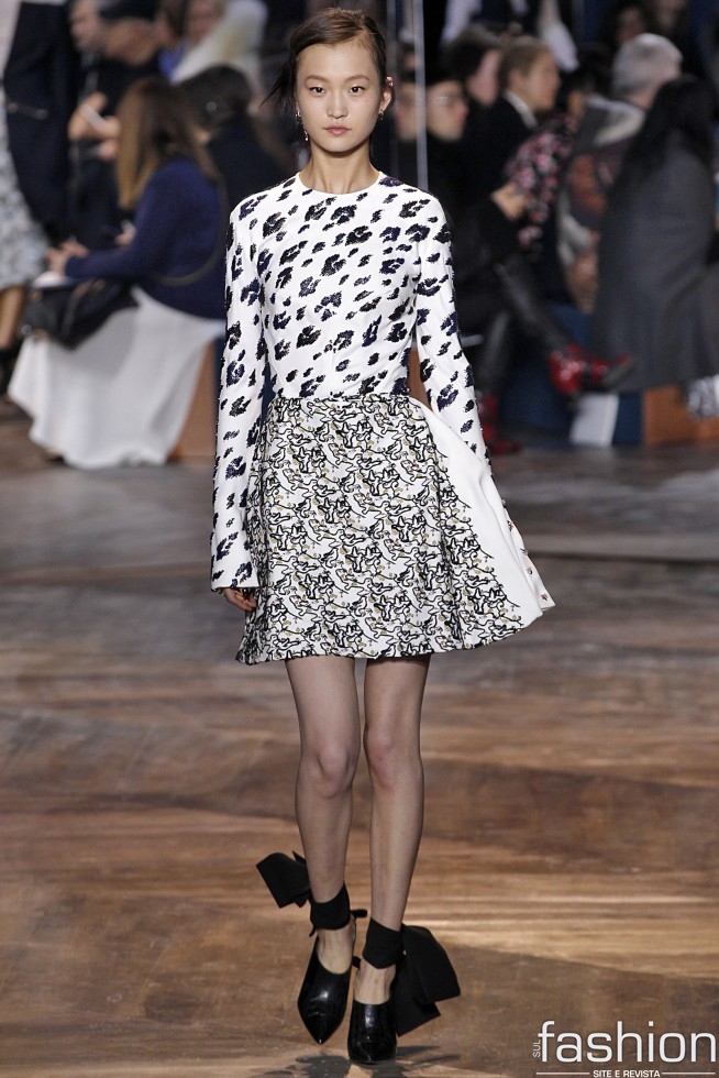 Dior- Serge Ruffieux e Lucie Meier, talentos da própria Maison, tomaram a frente do desfile e apresentaram toques fortes de sobreposição acompanhados do mix de estampas e dos decotes ombro a ombro.