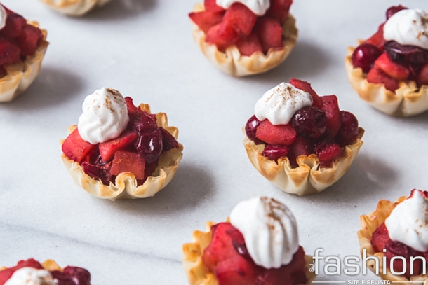 A receita de hoje é uma sobremesa sofisticada com ingredientes importados e com sabor único. A tortelete de cranberry e maçã pode ser servida como sobremesa em um almoço ou jantar especial para supreender seus convidados. Mas não se engane, essa receita é super prática, pois utiliza-se massa folhada pronta e bate chantilly. Esse é nosso segredinho, ninguém precisa ficar sabendo.