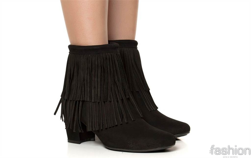 Franjas: As franjas prometem emprestar seu charme e descontração por mais um ano, especialmente nas botas de cano curto. Elas são uma das principais representações do estilo folk nessa estação, mas também podem ser usadas em looks mais arrojados.