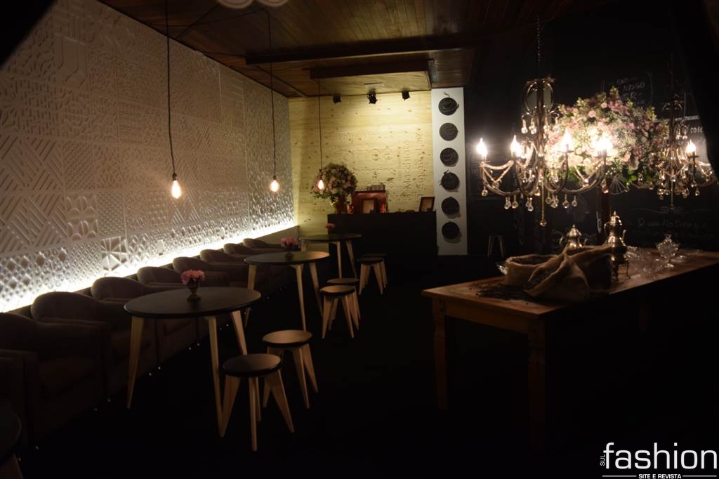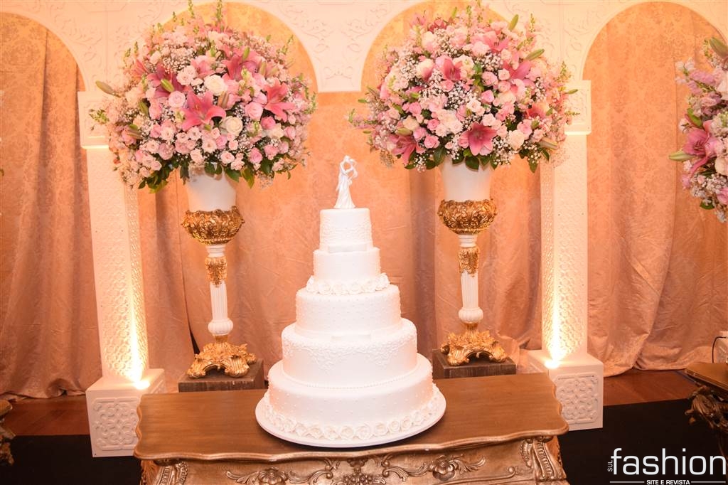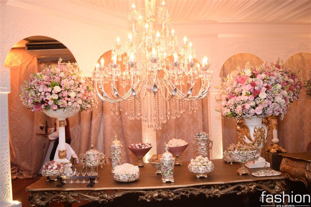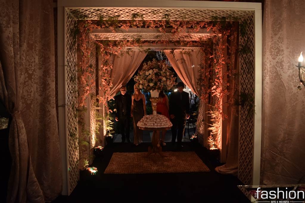 Os salões do Grêmio Fronteira receberam uma ambientação inusitada para o enlace. Das escadarias do clube ao salão nobre, o bom gosto e a originalidade foram destaques. Mais de 3000 metros de tecido jackard rosê foram usados para o revestimento. Na entrada, 3 enormes lustres caíam sobre um lindo jardim verde; no hall, pérgolas brancas e vazadas sustentavam a cascata de flores em tons rose; no salão de apoio, uma tradicional cafeteria foi reproduzida em detalhes pela Rinnovato Painéis Decorativos, empresa da família do noivo, que criou e executou a idealização de JC Lustres e Décor. Pérgolas, Mobília, Paredes totalmente revestidas com Painéis em 3D recortados em mdf com aplicação em pvc, brincavam com a história do casal desenhada pelo pai, Jeremias, proprietário da Rinnovato Painéis. Uma releitura dos jardins e cafés parisienses com o toque moderno dos materiais e da tecnologia.