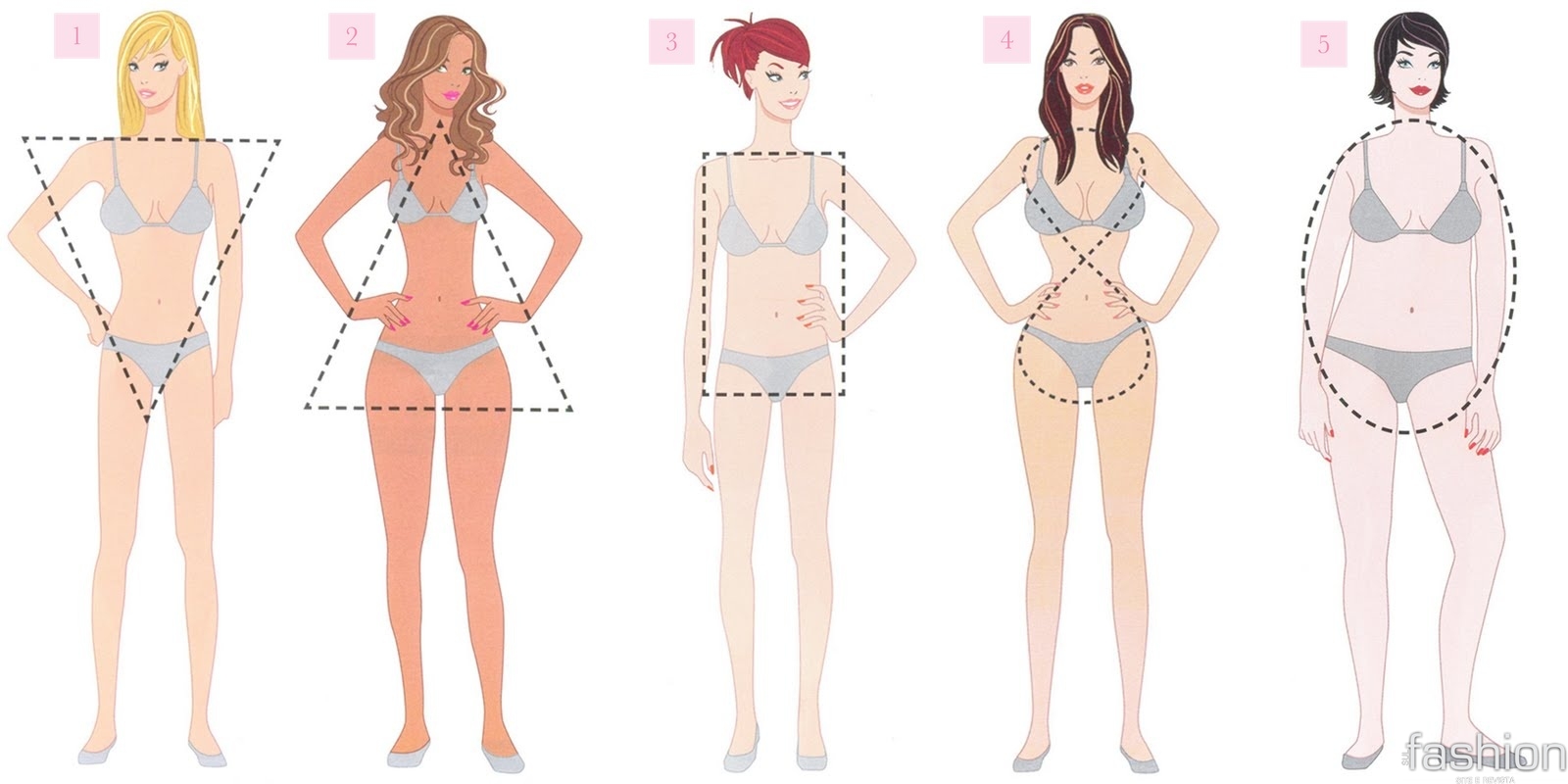 Mulheres com esse tipo de corpo têm ombros mais largos que quadris e coxas. Os seios são grandes, as costas largas e as pernas finas. Para deixar o corpo mais harmônico, invista em calcinhas que criem ilusão de volume, como as com listras horizontais, babados, drapeados ou estampas grandes. Já o sutiã frente única ou com alça reta são as melhores opções.