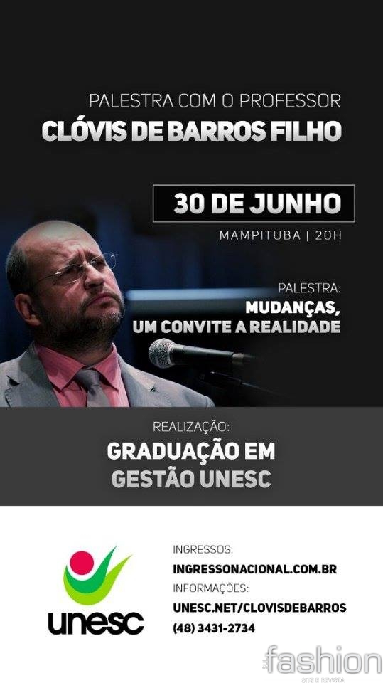 A palestra de Clóvis de Barros Filho é realizada pelos cursos de Gestão Financeira, Processos Gerenciais, Gestão em Recursos Humanos e Gestão Comercial da Unesc, com o apoio do Jornal A Tribuna, da Rádio Som Maior, do Sirecom (Sindicato dos Representantes Comerciais do Estado de Santa Catarina) e do Core (Conselho Regional dos Representantes Comerciais do Estado de Santa Catarina).