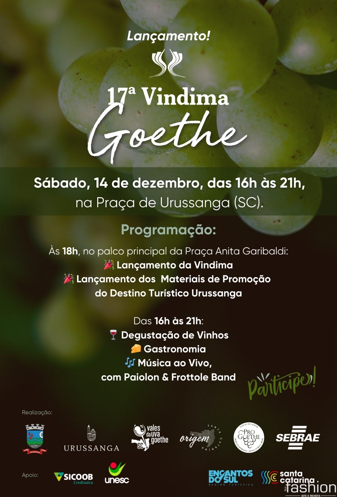A 17ª edição da Vindima Vales da Uva Goethe conta com o apoio de Sicoob Credisulca, Unesc e da Instância de Governança Regional (IGR) Encantos do Sul.