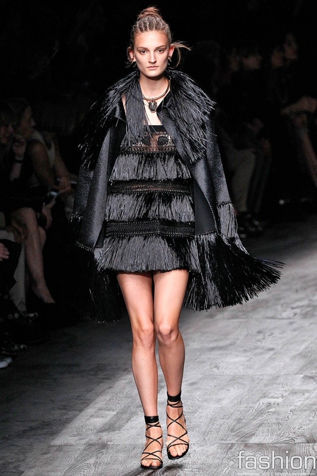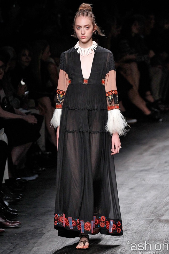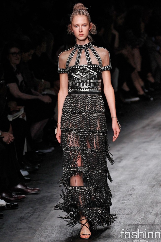 Além disso, as transparências e os detalhes nas barras das saias foram muito frequentes junto a decotes profundos e franjas levemente finas, compondo produções sofisticadas e singulares.