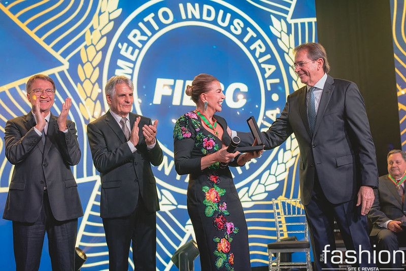 Cercada de amigos e da familia, Vera Olivo subiu ao palco e vibrou muito durante a cerimônia da entrega da homenagem que aconteceu na capital Florianópolis, na sexta-feira (21/6/2024) onde a Federação das Indústrias de Santa Catarina (FIESC) entregou a mais alta honraria do setor industrial do estado. Entre os agraciados, a empresária sul catarinense, Vera Olivo, co fundadora do conceituado Grupo La Moda, que recebeu das mãos do presidente da FIESC, Mario Cezar de Aguiar e do vice-presidente regional Sul da FIESC, José Carlos Spricígo, a importante laurea.