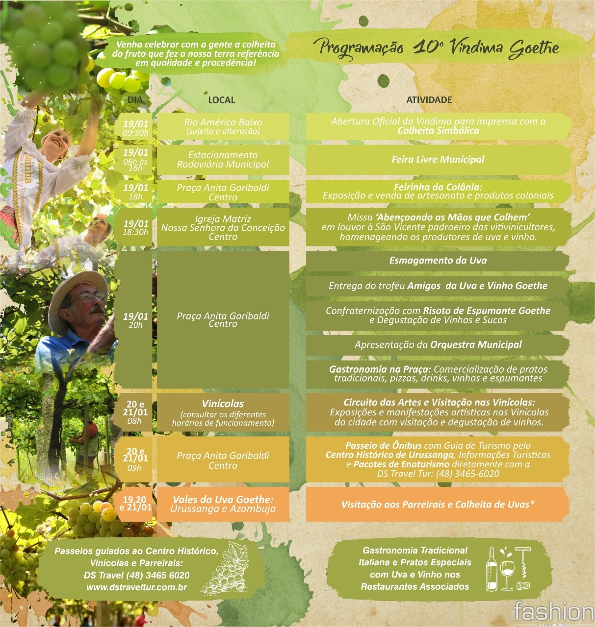 O evento Vindima Goethe é realizado anualmente pela Associação dos Produtores da Uva e do Vinho Goethe (ProGoethe) em parceria com a Prefeitura de Urussanga por meio do Departamento de Cultura e Turismo. Neste ano, a iniciativa também contou com o apoio do Núcleo de Turismo da Associação Empresarial de Urussanga (ACIU) e da agência oficial de receptivo DS Travel.