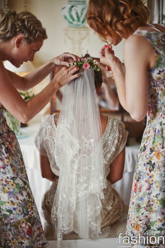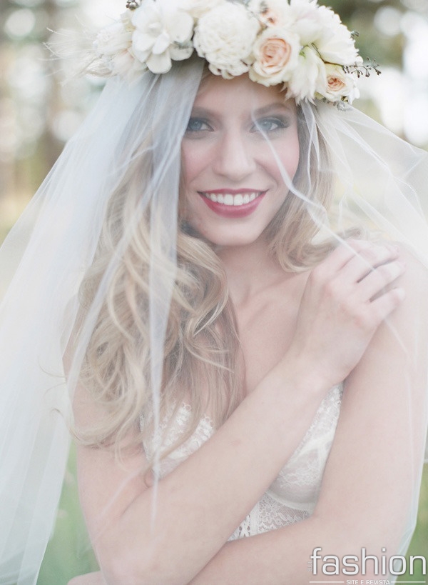 Dica: O ideal para as noivinhas com rostinho arredondado, é um véu preso em baixo do coque, e para as com rosto fino, um véu com volume preso na cabeça.